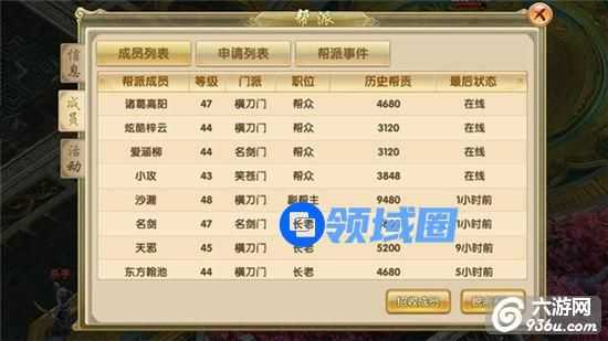 点开成员列表,你可以看到本帮派都有哪些成员,等级是多少,门派是怎么分布的,各自对帮派的贡献是多少,以及是否在线等实用信息。