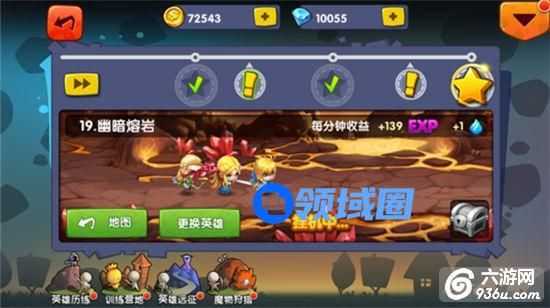 挑战完成一个大关卡后,可以领取一个宝箱,宝箱中可以获得装备、材料、钻石等各种材料。同时,挑战的英雄还能获得挂机的经验和技能书。难度越高的关卡,挂机获得经验越高。