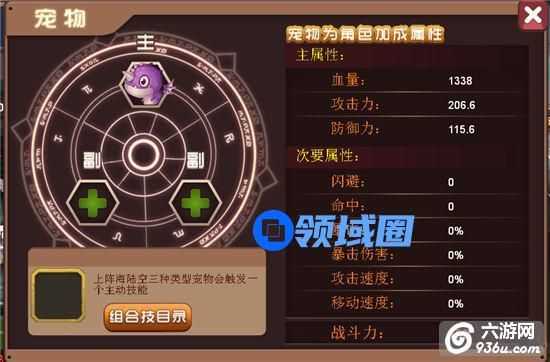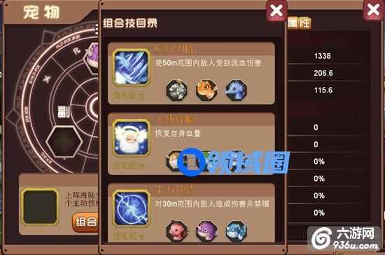 在宠物选择界面可以查看宠物提供属性以及宠物搭配的组合技能目录。