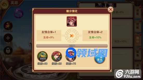 4、缘分培养可以用缘分卡片或对应的英雄碎片/装备碎片来提升经验值。