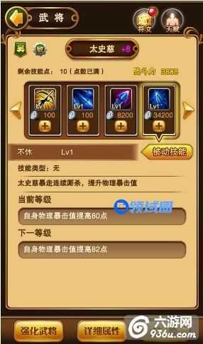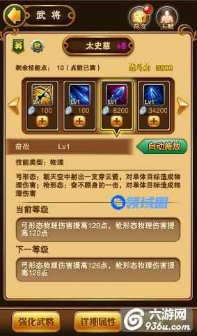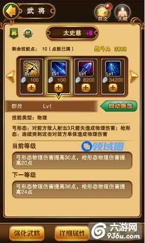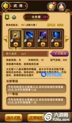 战斗姿态:太史慈的主动技能,冷却时间10秒,消耗怒气值200,每升一级弓形态物理攻击提高10点,枪形态物理防御提高3点,法术防御提高1点。
