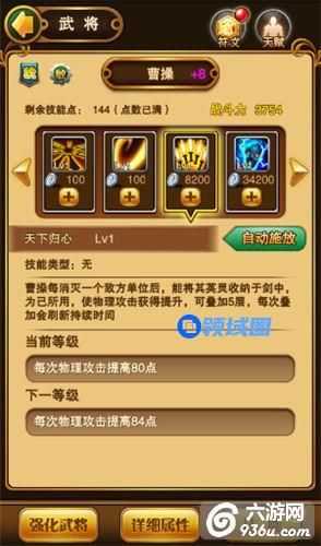 点评:该技能可以攻击到所有的敌方单位,由于曹操是个敏捷见长的武将,所以伤害量一般般。不过作为一个中排远程输出伤害仅次于后排输出,在该武将阵亡时有一个BEFUFF技能,会给敌方全体造成眩晕,小编个人觉得仅仅只能是在比武场找到一点存在感……