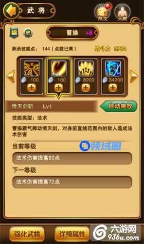 万剑归宗:曹操的主动技能,冷却时间18秒,消耗怒气值170,每提升一级法术伤害提高14点。