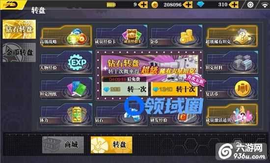 转盘招募算得上是玩家们最常用的方式之一了,在主界面右下角点击【商城】,再点击【转盘】就可以看到转盘招募的界面了,转盘又分为钻石转盘和金币转盘,对应的分别消耗钻石和金币,其中钻石转盘有有一定几率获取超级稀有坦克等各种道具,而金币转盘则有几率获取稀有坦克等各种道具,至于有多稀有,偶也不 知道反正偶没转到。金币转盘一天有五次免费的机会,用完了就要消耗金币了。而钻石转盘差不多两天才能免费一次,除此之外需要花费钻石进行钻盘,一笔不小的开支额,大家可自行自身情况招募适当次数以获取坦克及道具。