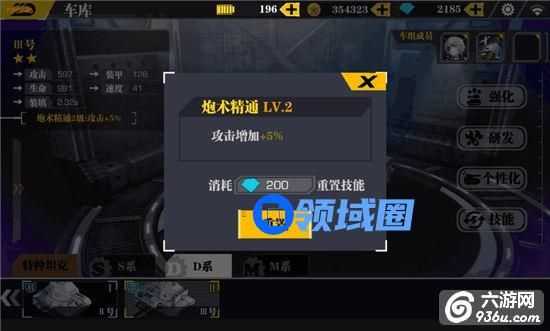 同样的, 在游戏主界面点击【车库】,然后点击【技能】,即可来到技能界面。每一种坦克只能装备一个技能,可花费钻石进行重置,以获取更高等级的技能,从而获得更多的战力属性加成。