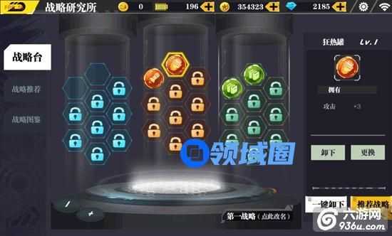 当玩家等级达到6级以后,在游戏主界面点击【战略】,就可以来到上图的战略界面了。玩家达到特定的等级后即可开启相应的镶嵌格,也可以花费钻石提前开启,在格子中嵌入各种战略道具即可大幅提高自身的战力属性了。