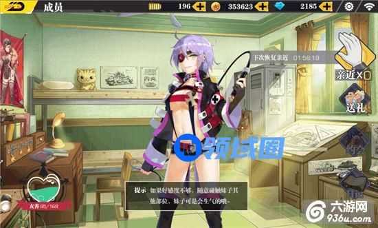 进入方法与上面类似,在游戏主界面点击【成员】,然后点击【互动】,即可来到上图的互动界面。互动这个玩法有点呃呃不好说,反正就是动动你的咸猪手亲近一下,送个礼物约个会什么的。至于是否会有以及有什么属性加成不好说,反正偶还友善度不够,不太清楚,属性加成应该有的吧,不然设计这玩法意义何在?