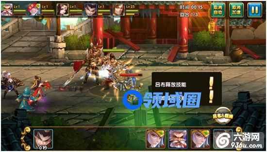 这边顺便给大家介绍下组合技能的使用,当组合内的所有武将都同时上阵后,在技能槽的上方会出现一个组合技能能量球,释放一遍对应武将的奥义技能即可为该能量球充满能量,当能量球能量满后点击该技能球即可释放组合技能,比如我是吕布与貂蝉组合技能,我释放一个吕布奥义技能和一个貂蝉技能就能为组合技充满能量,但放多个吕布奥义或者多个貂蝉奥义技能都只能充一半的能量,而无法充满,这个需要注意下。