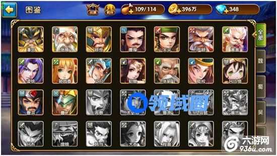 这边给大家介绍下游戏的图鉴系统,可以通过游戏主界面右上角的图鉴按钮,进入图鉴系统。图鉴实际上也相当于一个小的收集系统,一进来我们可以看到有些武将的头像是灰的有的头像是彩色的,武将头像颜色实际上表示着该武将是否在图鉴中已点亮,只要获得过一次对应的武将(任意品质都可)即可点亮对应的武将头像,头像即可变成彩色。