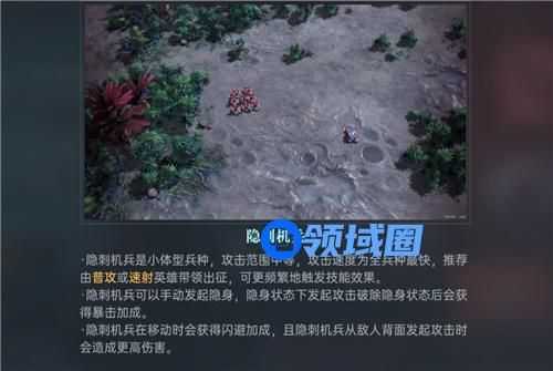 比如在小型集群这一大类上,“猛犬战士”以及“隐刺机兵”是其中两个小类。猛犬战士的喷气背包会在战斗中强化,获得移速提升,是偏功能性主打稳定的兵种。而“隐刺机兵”的机制则是战斗中隐身,在背击和破除隐身状态后获得BUFF加成,神出鬼没的战斗方式使其定位更侧重战术性。