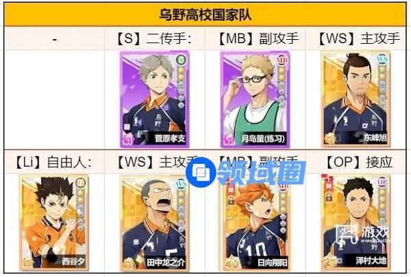 可以搭配不同高中的ssr强力主攻比如西谷夕以及东峰旭组成一只混搭队伍,综合能力也比较均衡,具体阵容可以参考这张图。