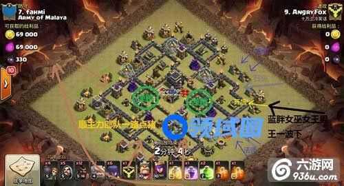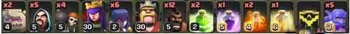 部队:石头坦克肉盾,用于踩炸弹,男王同理~女巫负责生产小骷髅造成对方防御的伤害溢出,同时有女巫存留收尾比较快,蓝胖主要输出,也是后排保护女巫的小肉盾~野猪主要负责点掉法师塔和迫击炮,防止其伤害女巫。
