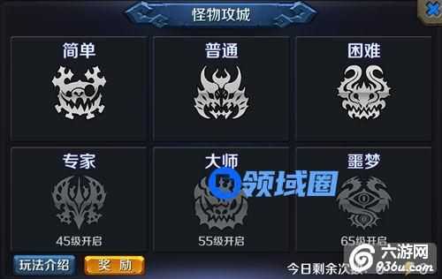 怪物攻城在15级时开放,共分为简单、普通、困难、专家、大师和噩梦六种难度,每种难度都有等级要求,难度越高,掉落的宝物越多,品质也越好。