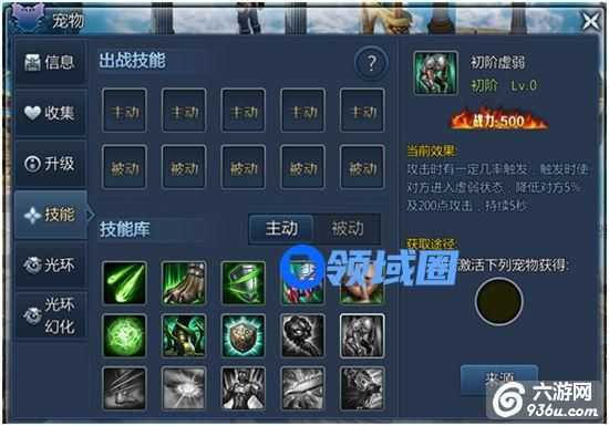 A、点击“技能”进入宠物技能界面。技能分为主动和被动技能。