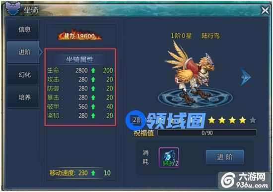 2、消耗材料进阶,可以获得祝福值,祝福值达到一定程度,可以进行坐骑升星,每一阶为十星,升星可以增加坐骑的基础属性。