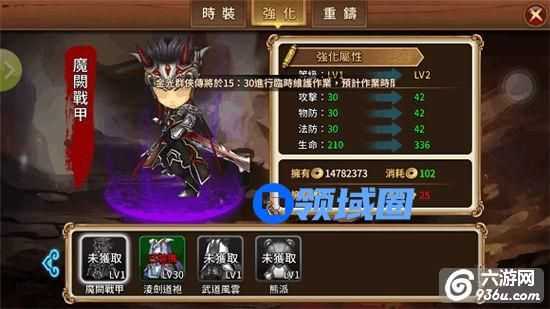 “时装”可使用“强化”提升等级来获得更高的基本属性加值,升级需要消耗一定的”铜钱”和“时装精华“,“时装精华”可通过“论剑商店“、”灵魄阁“或者特殊活动等途径获得。