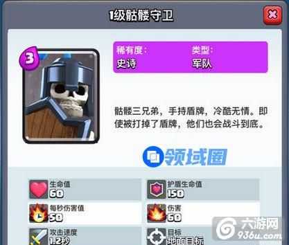 骷髅守卫的骷髅有三只,相比骷髅少了一只,但是骷髅守卫有了盔甲和盾牌,生存能力和防御力更强了。骷髅守卫可以用来防御各种大单位。以前骷髅虽然数量多了一点,但是血量和生存能力并不强,输出能力也差了些,作为辅助卡比较多。