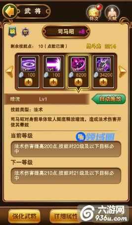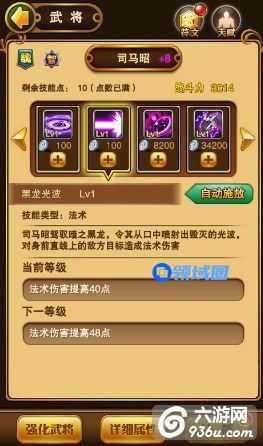 黑暗旋涡:司马昭的主动技能,冷却时间20秒,消耗怒气值200,每升一级法术伤害提升4点。