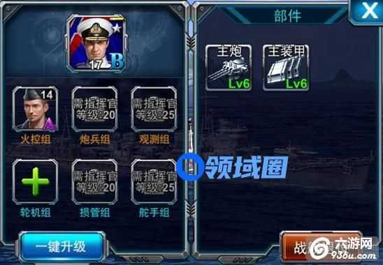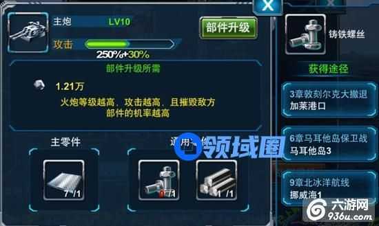 我们还可以对战舰的部件,如主炮,主装甲等部件进行升级,等级越高,攻击越高,这些升级部件所需要的零件我们可以从战役副本中获取。