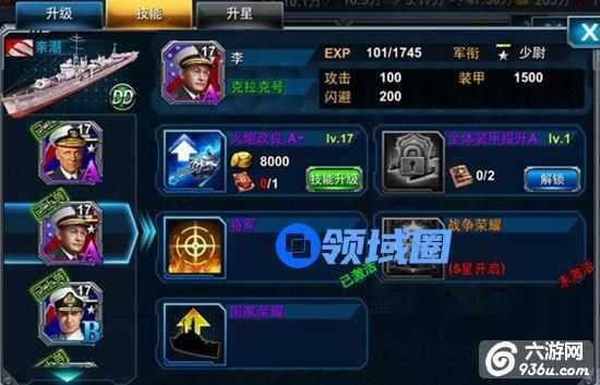 除了提升舰长等级外,我们还可以提升及解锁舰长的各项技能,以及对舰长进行升星等方式来提高战舰的战斗力。