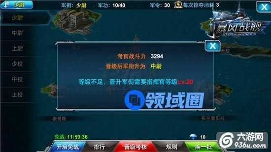 在玩家到达19级时,便可以开启《暴风战舰》中的军衔系统。作为核心玩法之一,军衔系统涵盖了掠夺、保护和军饷三种基本互动形式,其中掠夺自然是指的同军衔玩家之间可以互相攻伐,夺取资源和军功了,敌人的军衔越是高于自己,那获胜后夺取的各种奖励也就越多。需要注意的是,每次掠夺的指令都需要消耗3个军令,而如果没有开通VIP的话其上限为固定的30军令,每天重置并且不会随着时间恢复。军功达到一定程度时就可以参加晋级考核,成功后即可提升军衔。另外,如果你一不小心成为了军衔第一人的话,还么你还会在主界面上出个风头的噢。