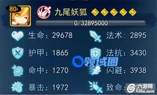 80级5星九尾妖狐基础属性图(神通:归元、凌云步、求生意志;未穿戴装备)