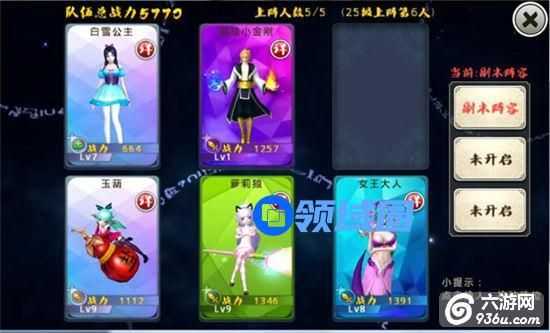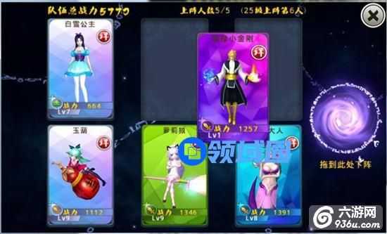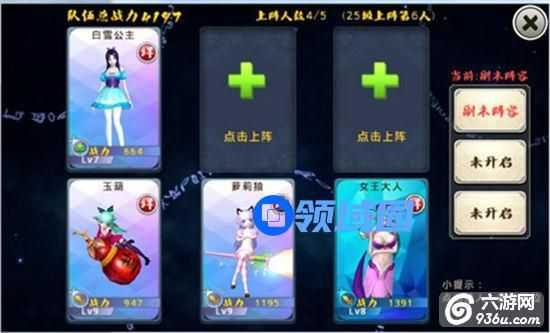 左上方有上场所有伙伴战斗力的总和,右上方则是已经上阵的人数/最多上阵人数阵容选择。