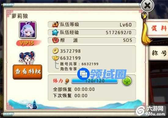 其中我们可以看到玩家战队的等级、玩家距离下一等级所差的经验、玩家的帮派名称、玩家所持有的金币数、元宝数、玩家的体力值以及玩家VIP等级。