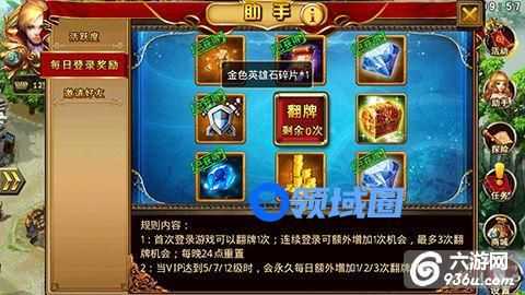玩家每日登陆游戏,就可以获得1次翻牌机会,连续登陆可以额外获得1次翻牌机会,这类型连续登陆的翻牌奖励,最多可以累积到3次。如果连续登陆期间间断登陆,那么翻牌次数将会恢复成1次。另外,对于VIP玩家来讲,会根据VIP等级的不同获得额外的翻牌机会。所有类型的翻牌奖励,最多可以累积到每天6次。