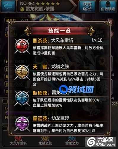 队长技,雷龙之力:位于后排的雷属性队友伤害增加50%,最大生命值增加50%。