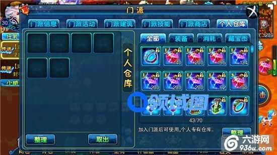 加入门派即可每天在门派活动中的“门派工资”领取门派工资礼包一个!如果你还在为背包栏过少而烦恼,门派“个人仓库”也能为您排忧解难,随着门派建筑“仓库”的提升,可供玩家使用的个人仓库空间也会越来越大!