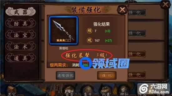 强化消耗:装备强化需要消耗银币,装备等级越高,强化需要的银币越多。