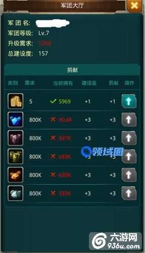 军团大厅可以进行资源捐献,增加军团建设度,增加个人贡献度。