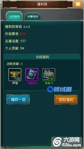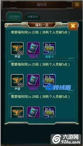 加入军团的朋友每天可以在福利院花费少额贡献度换取福利。