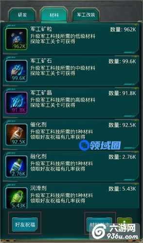 2、军工科技需要激活和升级,科技分为:属性加成类、生产/改造省时、开放特殊改造