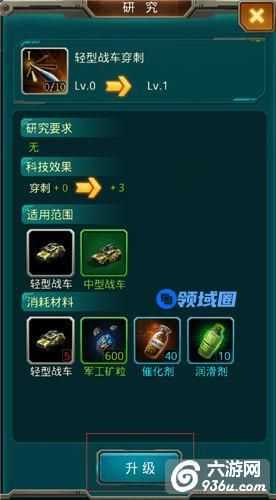 1、进入军工科技界面,选择对应的坦克种类,点击最右边的按键(灰色为不可点击),进入军工科技升级界面,选择已亮的科技,点击“升级”即可。