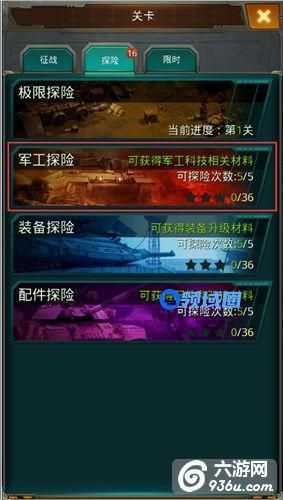 7、关卡"探险"分页新增"军工探险":攻打通过可获得军工材料