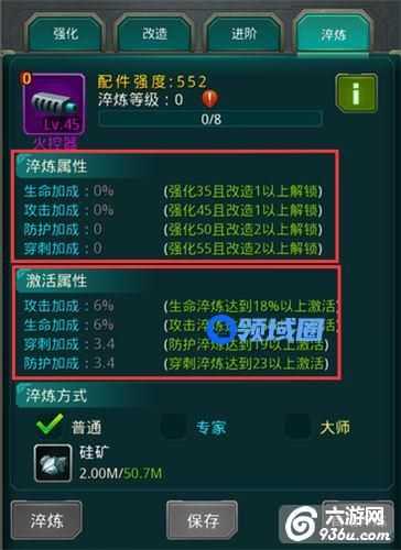 (2)当配件强化等级和改造等级提升后,逐步解锁淬炼属性;