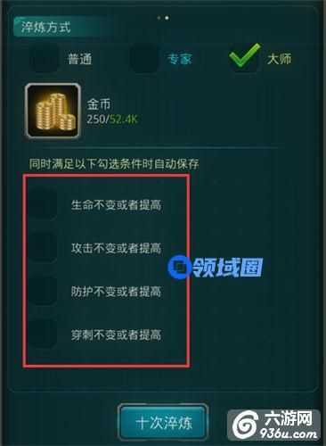 淬炼有普通(消耗硅),专家和大师(消耗金币)3种消耗方式;