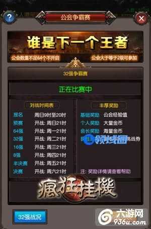 公会争霸是公会间的对抗。每周一整轮,周日报名。3级以上公会会长和副会长都能报名。当报名人数不足64个公会时,本周公会战取消。报名后每天晚上20点进行公会争霸赛。周日晚上是预赛,争夺64强名额;周一决出32强,以此类推,周六是决赛。决赛胜利公会是本次公会战冠军。参与公会争霸赛即可获得大量金币奖励,玩家通过签到、挑战神龙活动和公会战获得的贡献值可以在公会兑换里兑换物品。