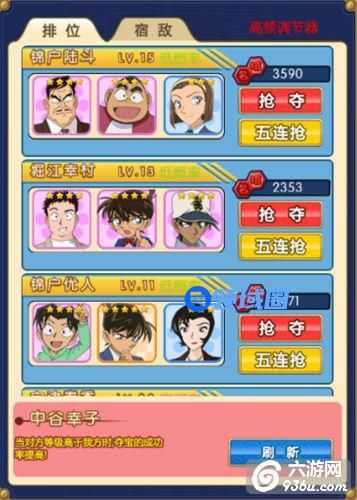 抢夺的方式分为单次抢夺和5连抢两种方式。玩家可以在抢夺界面看到对方的等级、出场人物、战斗力以及抢夺概率等信息。如果对随机筛选出来的对手不满意的话。还可以通过右下方的刷新按钮进行重新筛选。不同于副本刷图消耗精力,科技抢夺是消耗体力的哦~需要注意的是,抢夺战斗胜利后,是有几率获得碎片的。所以要做好多抢几次的准备哦~