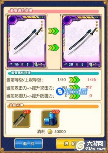 武器升阶类似于卡牌升阶,点击武器界面后就可以看到进阶按钮。不过不同于卡牌升阶,装备升阶只能提升等级上限、攻击力与防御力这三种属性。升阶消耗的能源道具可以通过分解装备的方式来获得。同卡牌升阶一样,装备升阶也要求装备必须是四星或者五星哦~