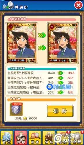 在名侦探柯南游戏中提升战力有很多种手段,比如人物缘关系,装备升级,科技碎片合成等等。但是要说到大幅的提升战斗力,游戏中其他的方法可不如下面我要介绍的系统效率高~,这就是升阶系统~