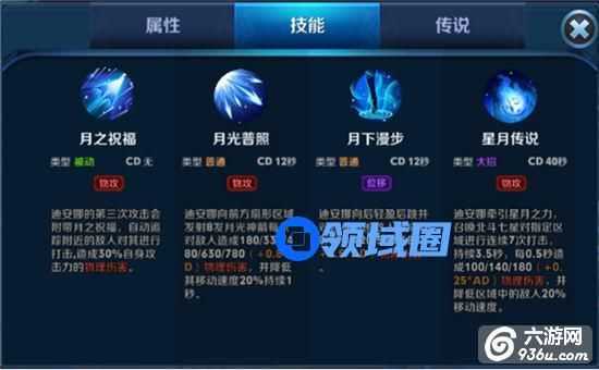 迪安娜牵引月亮之力,召唤陨石对指定区域进行连续7次打击,持续3.5秒,每0.5秒造成100/140/180物理伤害,并降低区域中的敌人20%移动速度。