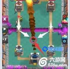 这里还需要说一下,有的大神一看你是召唤流,他可能直接放下X弩做防守用,虽然不够距离打你的塔,但是可以打到你中间稍往前这个位置上的房子,然后他可以很好的为后续的野猪,骑兵,气球铺路,这里呢活学活用,先不要着急。