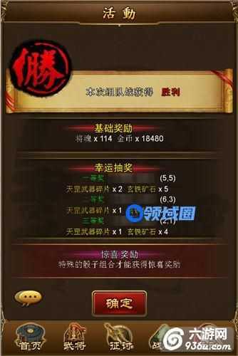 首先,三军全部败退(好悲壮的感觉~)或者副本BOSS扑街才会进行奖励结算!奖励结算界面之中,诸位主公通过掷骰子决定奖励,一位主公拥有两个骰子,最后根据点数大小分发副本奖励~好残忍!对了,如果三位主公的骰子点数达成某些特定的组合,将会获得额外的奖励!嘿嘿,会不会转角遇到爱呢~