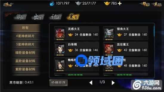 在黑市里面拥有大量的极品道具,在这里你能买到你所迫切需要提升战力的豪华道具,如果目前没有也不要灰心,黑市是每隔一段时间就会刷新的,总有一个时段会出现你所需要的道具。