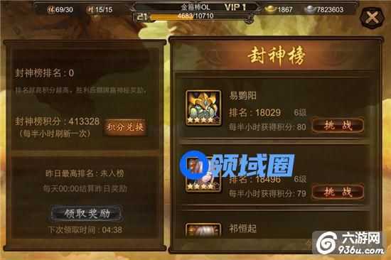 三、【玩法说明】:封神榜是实力的排名。每挑战一次其他玩家耗费一点精力和一个封神令。挑战成功可获得翻牌奖励,奖励封神榜积分、银两、封神令牌。玩家每半小时获得一次封神榜积分,积分多少与排名有关。封神榜积分可用于兑换蟠桃,蟠桃用于神仙培养。