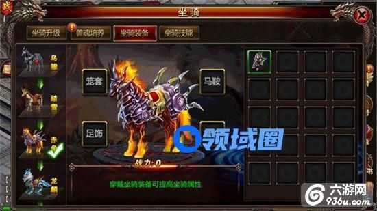 坐骑可以佩戴装备增加战斗力,有四个部分:笼套、马鞍、足饰、挂件。坐骑装备通过碎片合成获得,碎片主要在寻宝、禁地商城积分兑换获得。