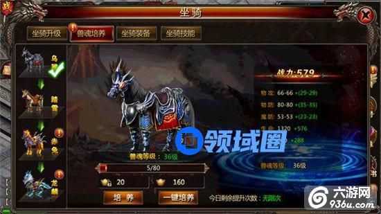 坐骑升级和兽魂培养都提高人物的攻击、防御、生命、魔法、暴击属性。每日首次提升坐骑等级和兽魂培养免费。